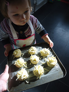 First, make sure said child has a pinny on, it's going to get messy. Stand them on a chair close to the bench and give them a spoon and pre rubbed in butter and flour in a plastic bowl.